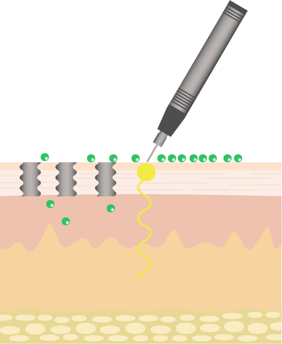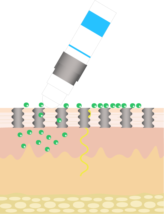 特殊な電気パルスでお肌の細胞の隙間をわずかに開けます。その隙間から電気反発力や浸透力、物理的押力で美容成分を深層までしっかり浸透させ、皮膚にダメージを与えることなく、美容成分を効果的に浸透させます。
